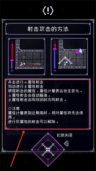 1、点击进行【α】属性射击会自动瞄准,划动释放【β】属性射击控方向,需关注属性计量表状态避免无法使用。