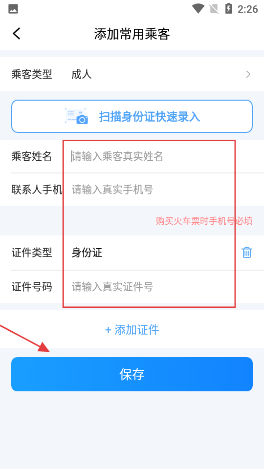 4、填写乘客姓名、联系人手机、证件号码等信息,点击【保存】,完成常用乘客信息添加。