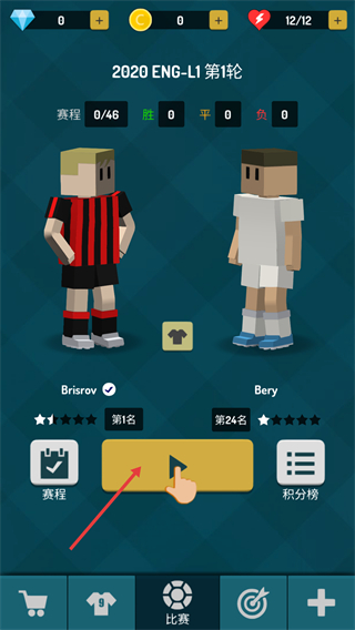 1、在第1轮界面,查看赛程(0/46)与队伍排名,点击中间按钮进入比赛,可通过赛程、积分榜功能管理赛事进度。