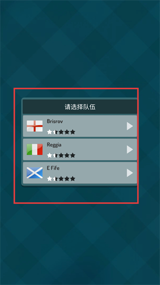 2、在“请选择队伍”界面,可挑选Brisrov等球队,不同球队星级不同,对应初始实力有差异,按需选择后开启比赛。