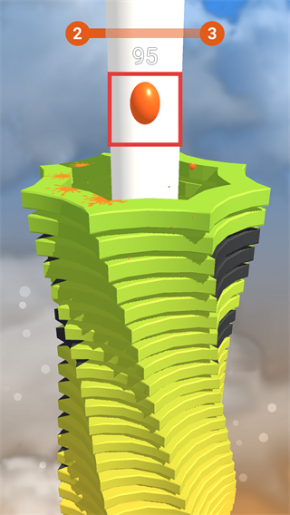 2、开始挑战后,【长按屏幕】操控红色框内的【橙色球】在白色柱子上向下掉落,击碎绿色堆栈层。
