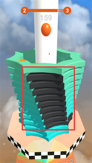 3、避开红色框内的黑色堆栈层,持续向下掉落橙色球,积累分数。