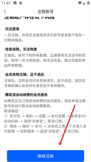 4、阅读注销须知,确认后点击页面底部的【继续注销】按钮,完成账号注销操作。