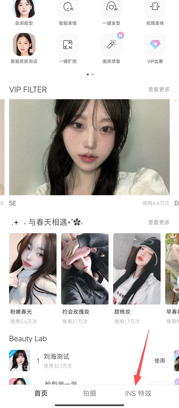 1、打开甜盐相机,点击底部【INS特效】,进入特效选择界面,开启特效拍照之旅哦。