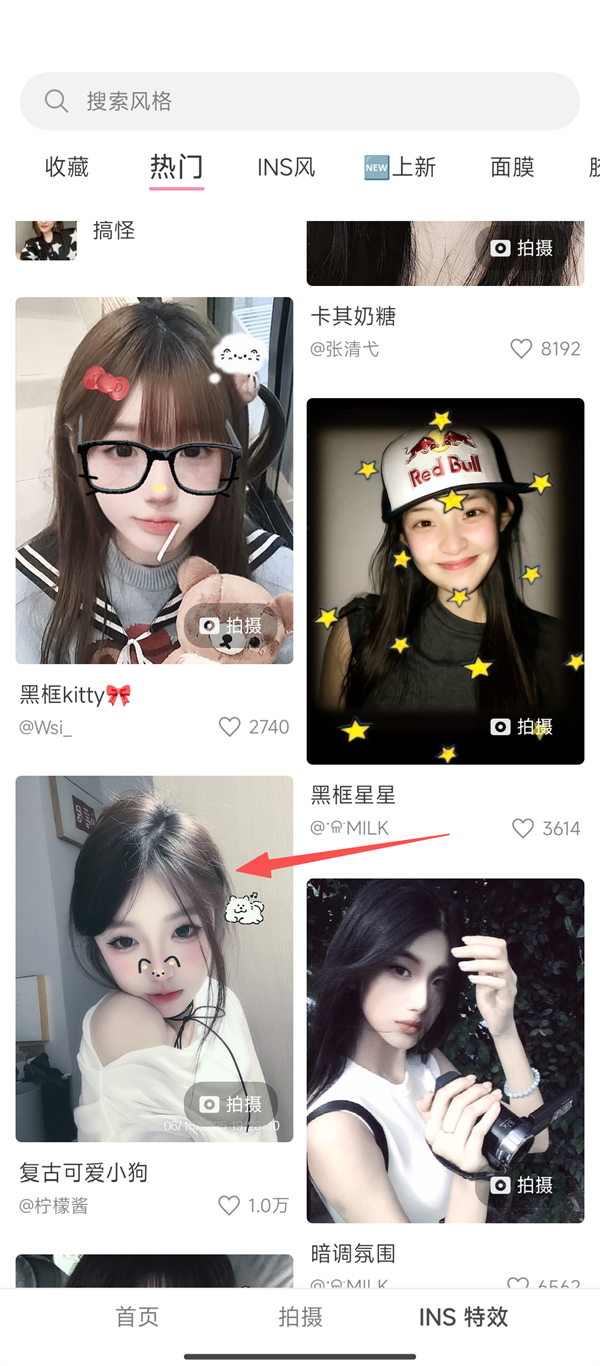 2、在INS特效界面,挑选喜欢的特效,像【复古可爱小狗】这类,点击进入拍摄界面啦。