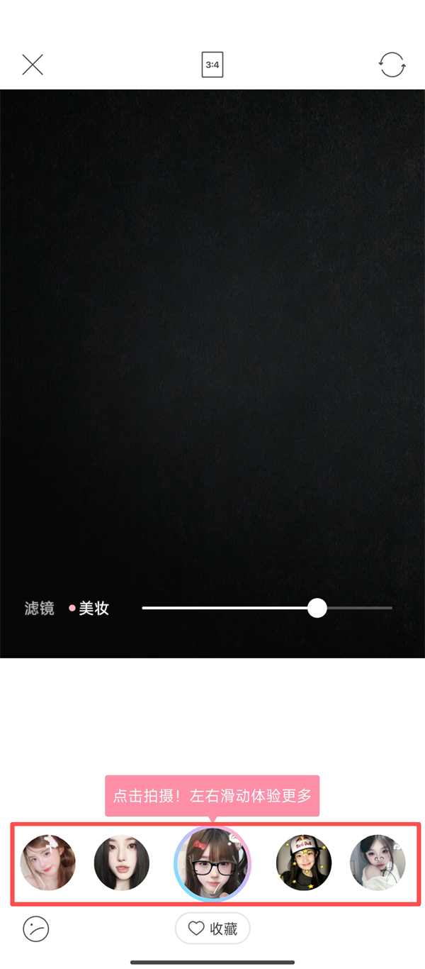 3、进入拍摄界面后,左右滑动底部特效栏体验更多特效,还能调整【滤镜】和【美妆】参数呢。