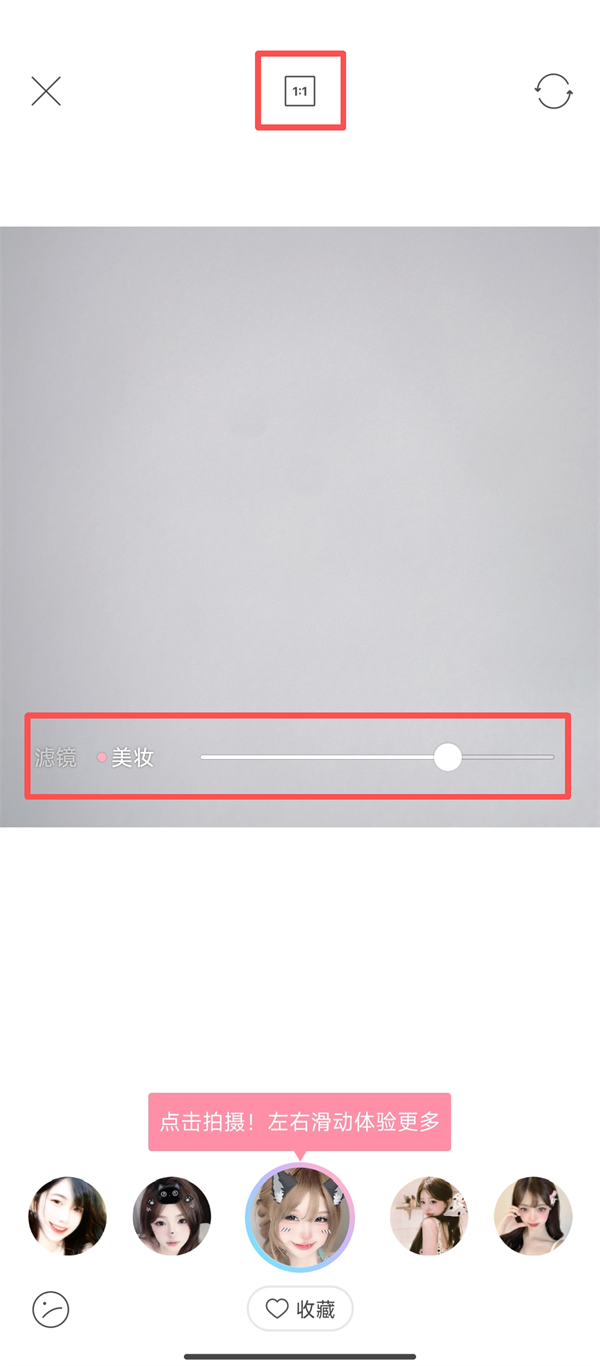 4、点击顶部比例按钮切换拍摄比例,拖动滑块调整特效强度,然后点击拍摄,就能用特效拍出好看的照片啦。