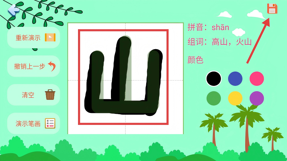 4、在格子里临摹山怎么写,写完后点击右上角的保存图标,可保存【山】字的相关内容。