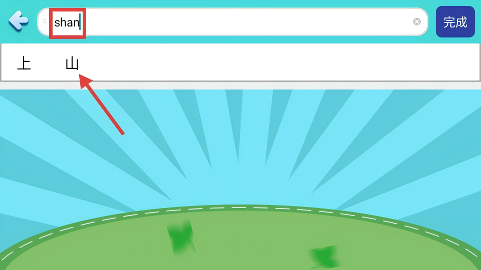 3、在输入框中输入【shan】,然后点击对应的【山】字。