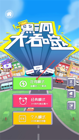 1、进入游戏选择【吃鸡模式】,目标是做最后一个黑洞,熟悉模式规则后开启吞噬冒险。