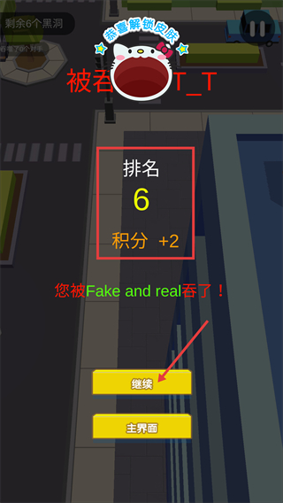 4、结算后查看排名和积分,点击【继续】开启下一局,总结经验调整吞噬策略以提升排名。