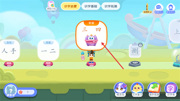 1、进入【识字启蒙】界面,选择【数量】模块学习【三】【四】汉字。