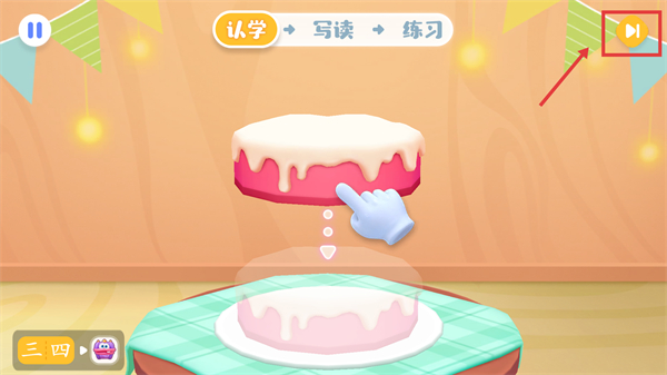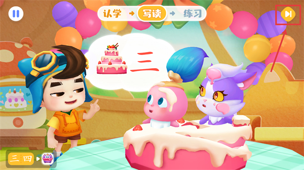 2、在【认学】环节,按手势提示互动,点击右上角播放按钮推进流程,借助蛋糕场景熟悉【三】【四】对应的汉字内容。