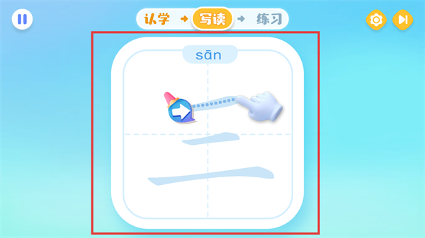 4、在【写读】的书写环节,跟随手势指引,在书写区域完成【三】的书写练习,同时对应读音【sān】巩固认知。
