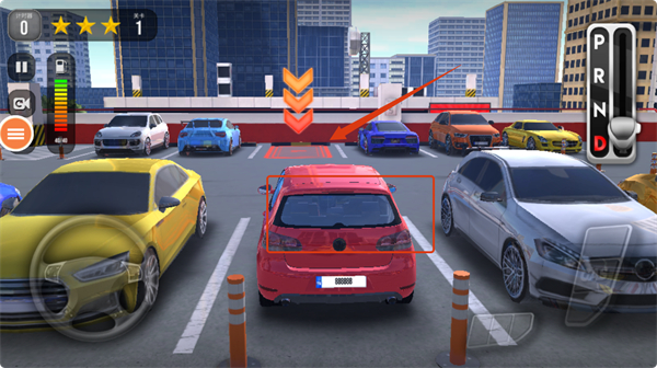 2、在停车场中,根据橙色箭头指引,操控汽车向目标停车位移动,注意避开周围车辆。
