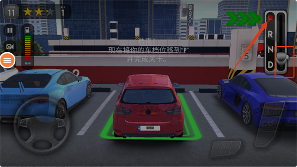 3、将汽车停入目标车位后,按照提示将档位移到【P】档,完成【关卡1】的停车任务。