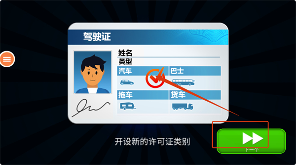 4、完成停车任务后,获得汽车驾驶证,点击【下一个】按钮,可开启新的许可证类别挑战。