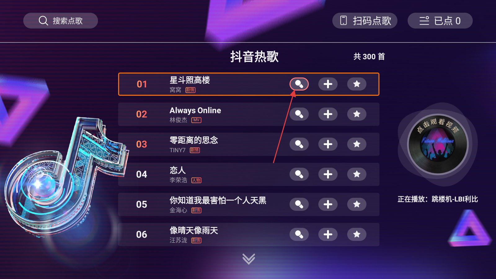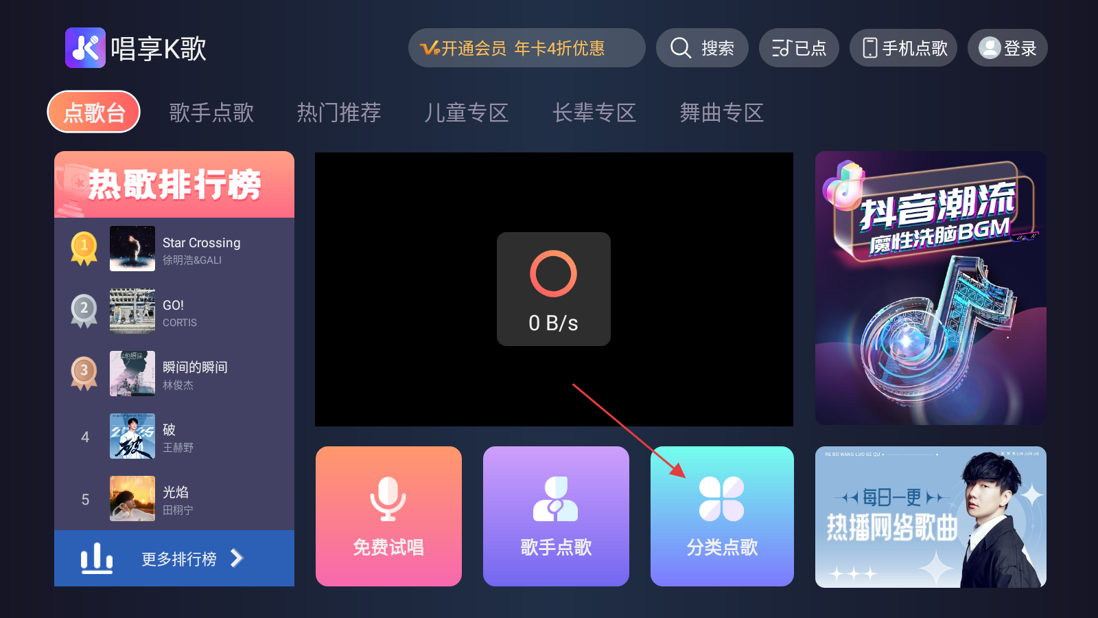 2、在分类点歌页面,点击【抖音热歌】分类,进入抖音热歌列表。