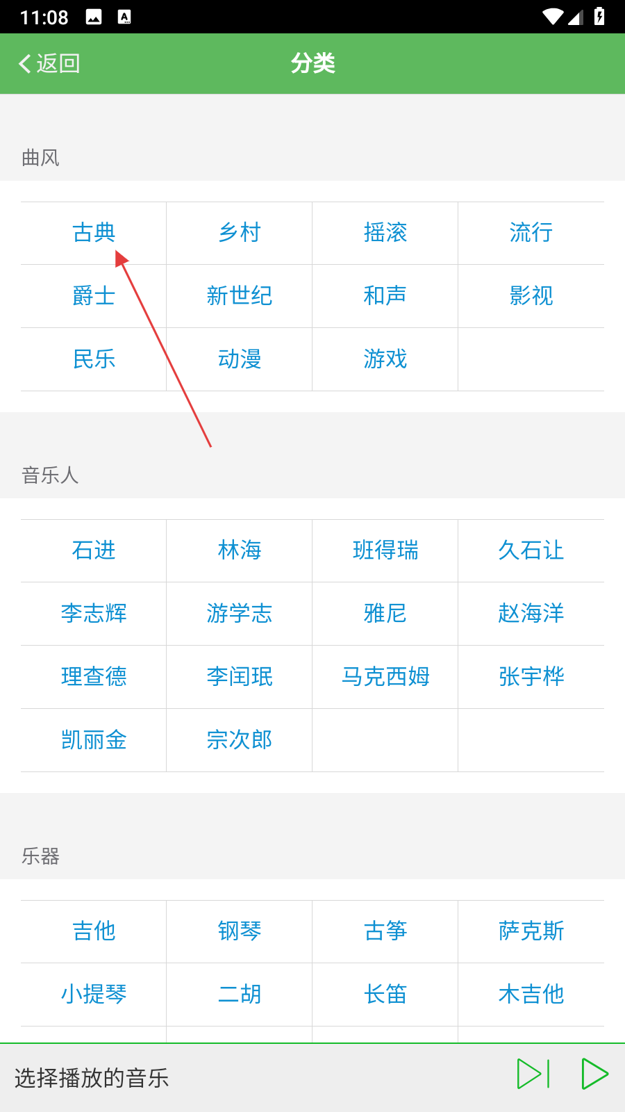 2、在分类页面,点击【古典】,进入古典音乐列表页面。