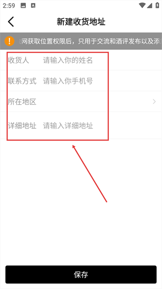4、依次填写收货人、联系方式、所在地区等信息,完成后点击【保存】按钮,完成收货地址的添加操作。