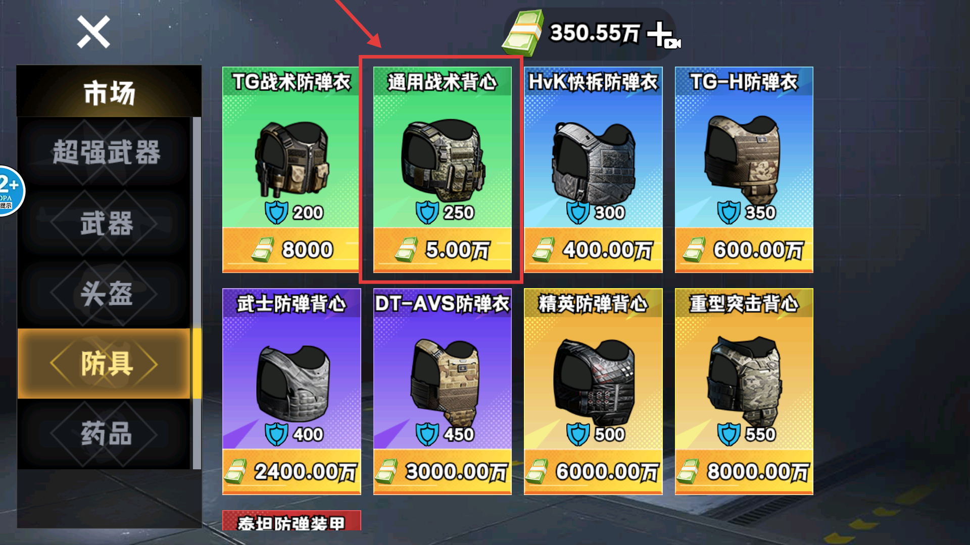 1、进入市场界面选择防具分类,优先购买防护值高的装备提升生存能力,为后续战斗做准备。