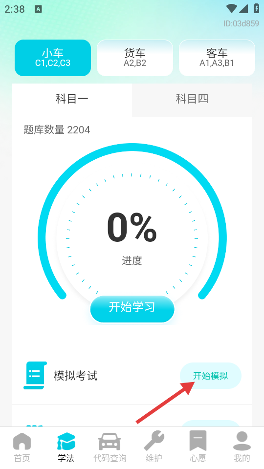2、进入学法页面后,选择车型,点击【开始模拟】按钮。