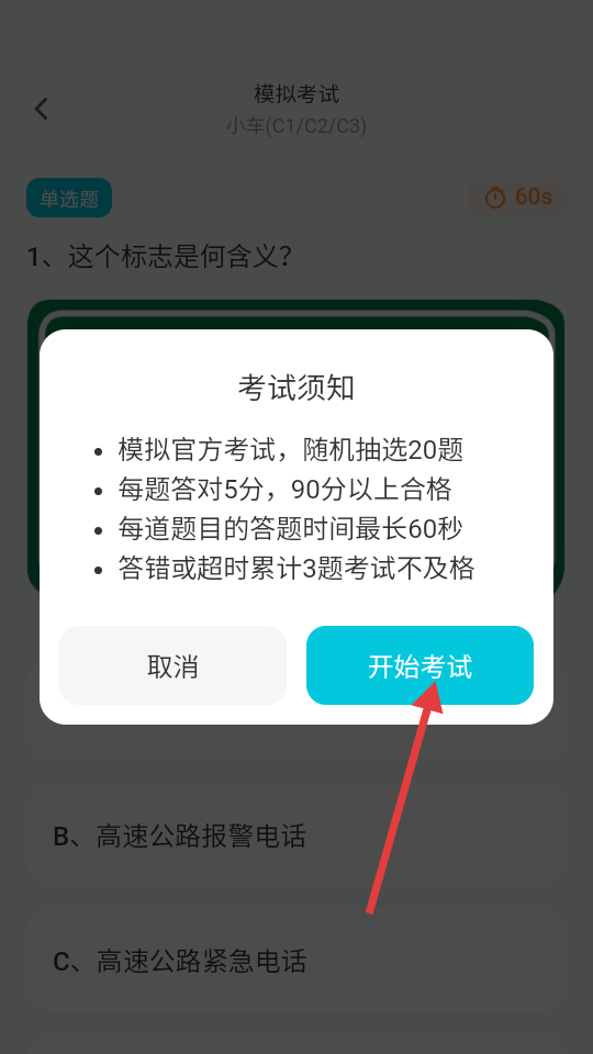 3、在弹出的考试须知界面,阅读须知后,点击【开始考试】按钮。