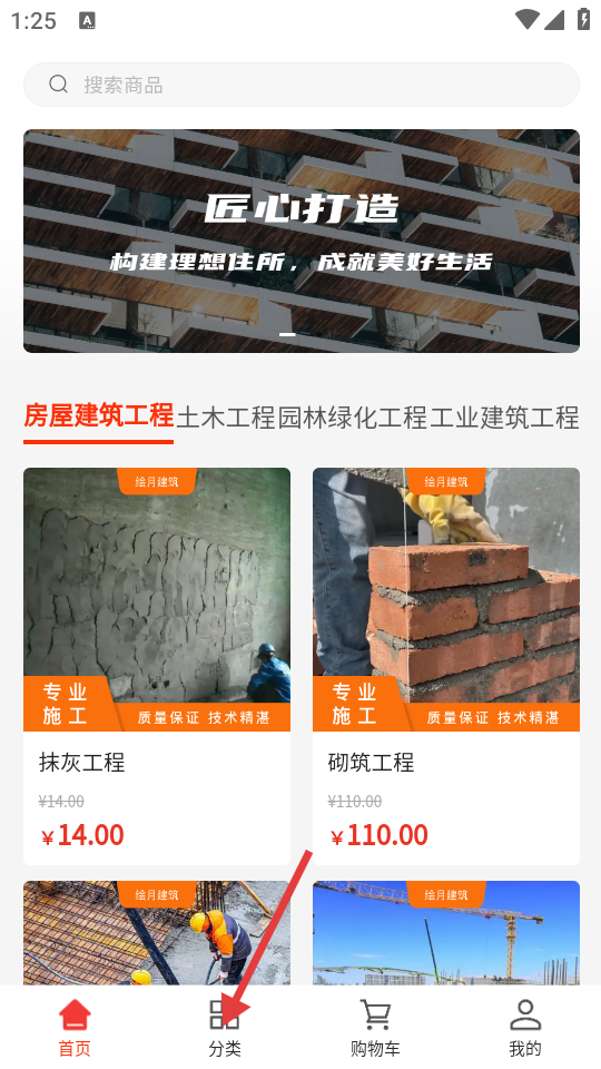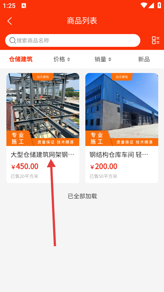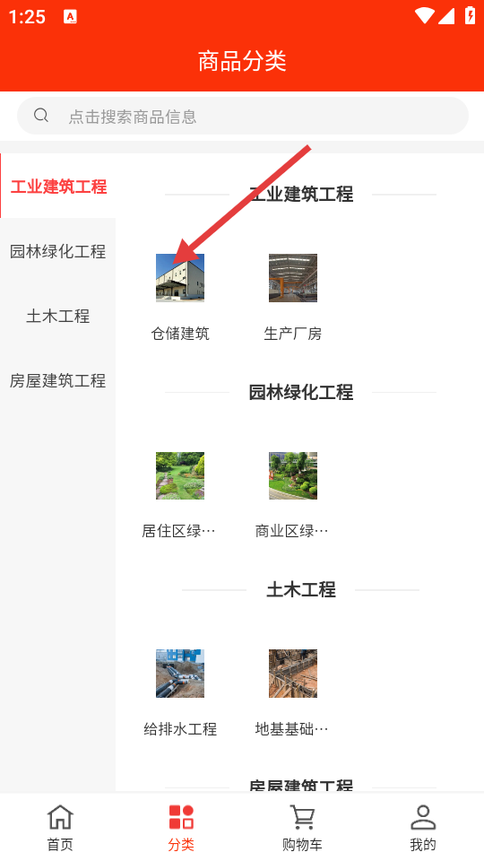 2、在商品分类页面,可选择工业建筑工程类别,点击【仓储建筑】。