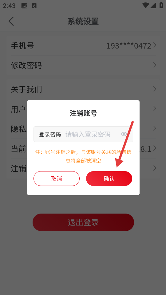 4、在注销账号弹窗中,输入登录密码后,点击【确认】按钮,即可完成账户注销。