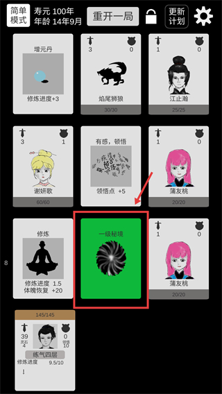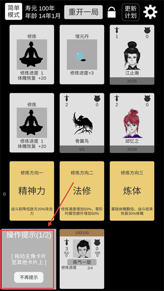 1、拖动主角卡片至其他卡片,可触发修炼或恢复效果,提升进度与体魄数值助力前期基础养成。