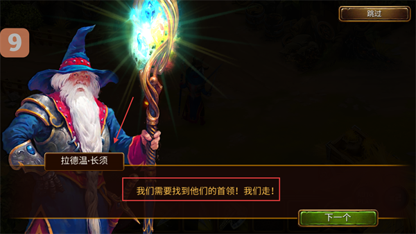 3、遇到剧情对话点击【下一个】按钮推进,跟随巫师指引寻找敌人首领,解锁后续任务内容。