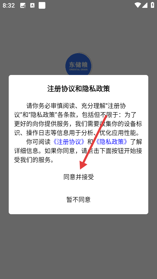 1、打开APP,在弹出的“注册协议和隐私政策”提示框中,点击【同意并接受】。