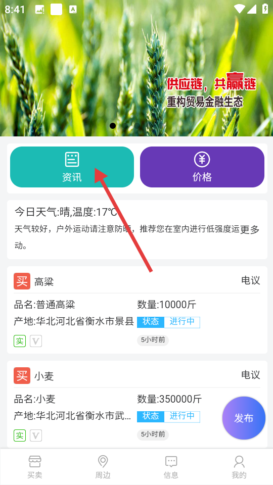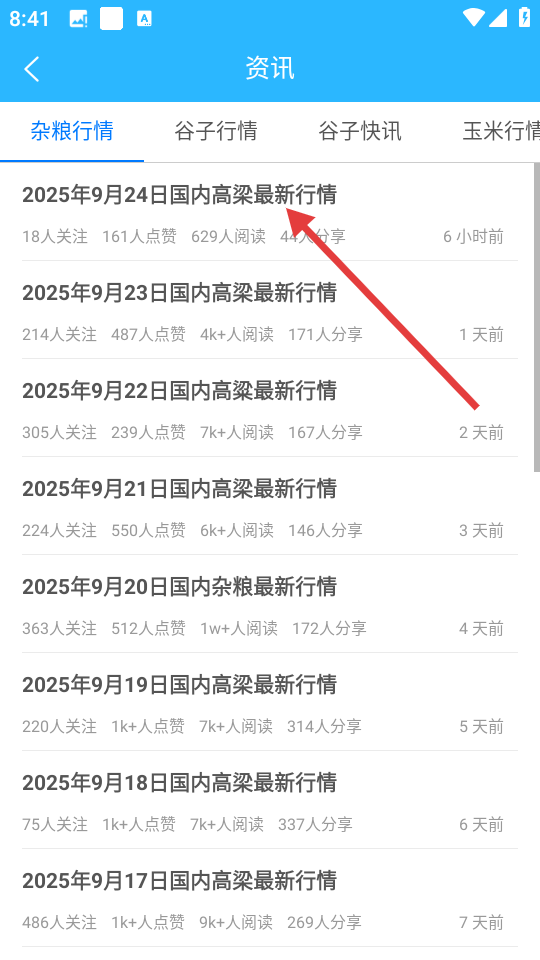 3、在资讯页面,找到并点击想要查看的高粱行情资讯。