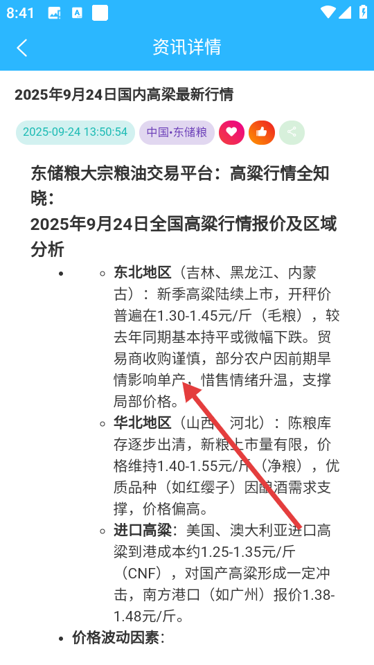 4、进入资讯详情页,即可查看全国高粱行情报价及区域分析等详细内容。