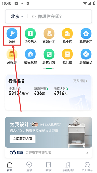 1、在首页点击【装修】功能按钮,进入被窝家装页面,可获取装修相关的设计、报价等服务。