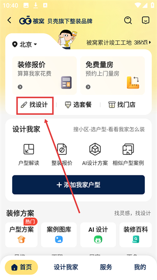 2、进入装修页面后,点击【找设计】选项,切换至设计师相关板块,可查看设计师榜单及作品。
