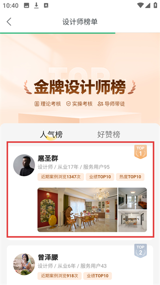 3、在【设计师榜单】页面,找到设计师,点击进入该设计师的详情页面。