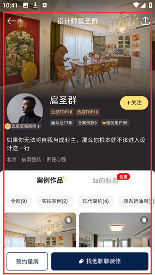 4、在详情页,可查看其从业17年等信息,还能通过【找他聊聊装修】咨询装修事宜。