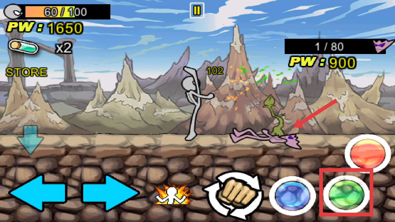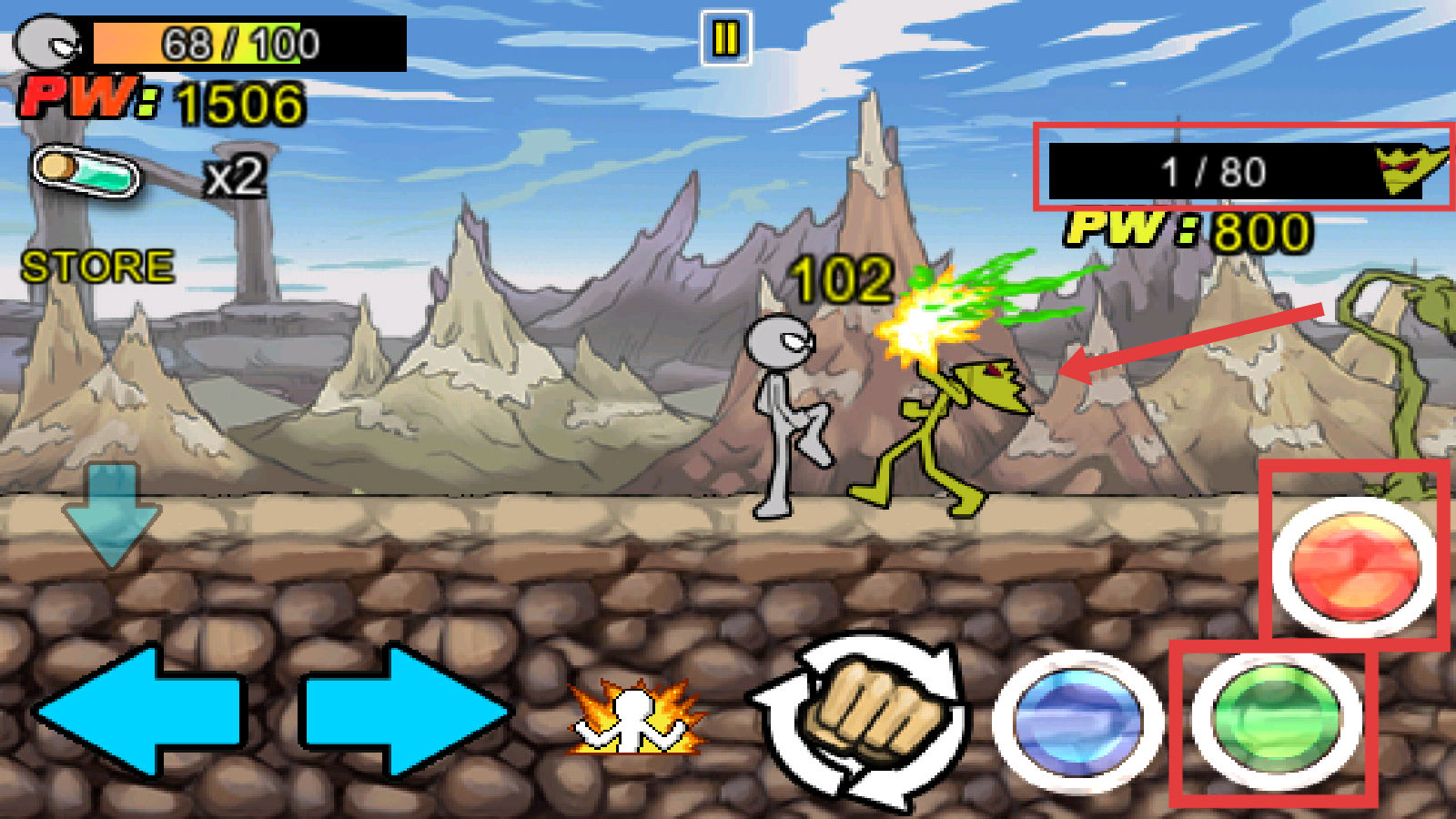 3、对付残血敌人时按下【绿色技能键】,能快速将其击倒,闯关进度蹭蹭涨。