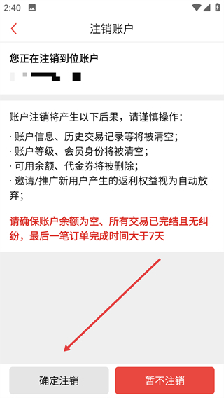 3、仔细阅读注销后果(信息清空、余额清零等),确认账户满足“余额为零、订单完成超7天”等条件。