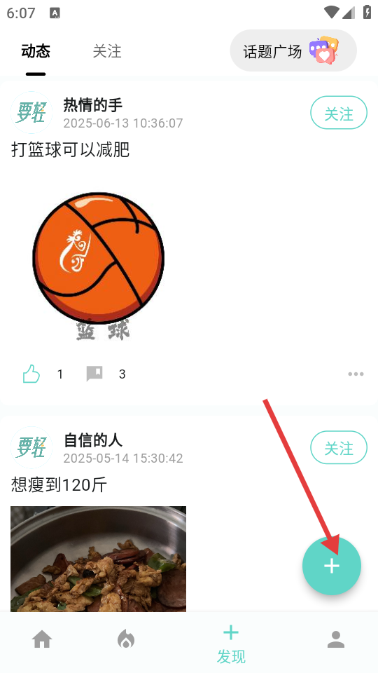 3、在发现页面,点击右下角的“+”号,进入编辑动态页面。