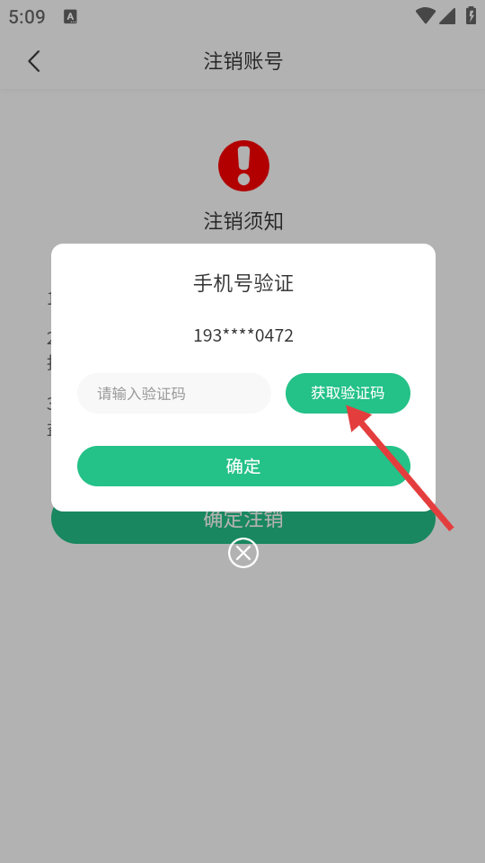 4、在手机号验证弹窗中,点击【获取验证码】,输入验证码后点击【确定】,完成账号注销操作。
