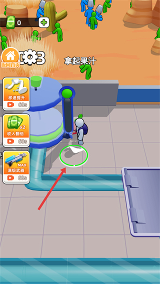 4、加工完成后,移动到红色箭头指向的绿色区域,【拿起果汁】,完成果汁的收集和提取。