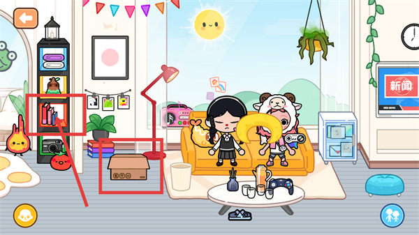 2、进入小屋后先观察,找到架子上的【书籍】和地面的箱子,这俩是可以互动收纳的物品哦。