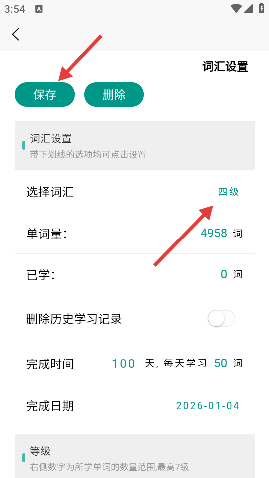 2、在词汇设置页面,选择要学习的词汇等级,例如“四级”,设置好单词量、完成时间等信息后,点击【保存】按钮。