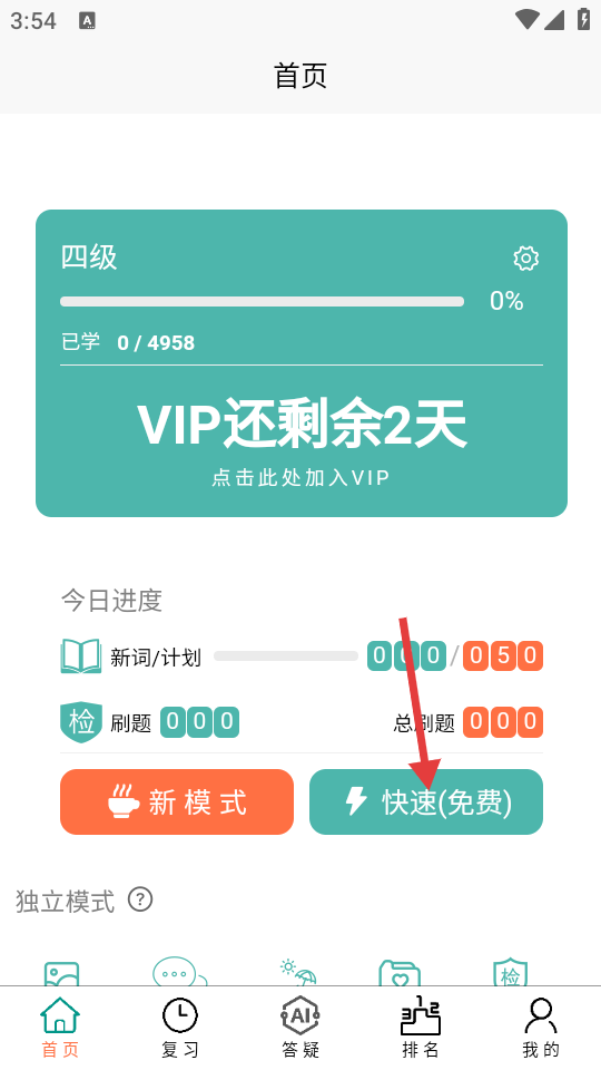 3、保存后回到首页,点击【快速(免费)】按钮,进入单词学习页面。
