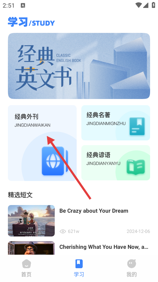 2、在学习页面,点击【经典外刊】,进入经典外刊列表页面。