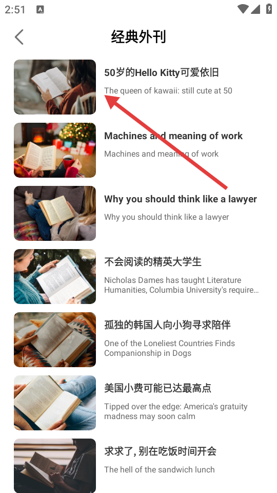3、在经典外刊列表页面,选择想要阅读的外刊文章。