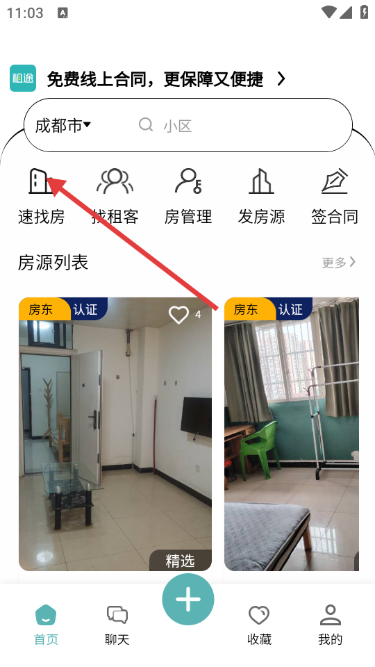 1、在首页点击【速找房】,进入找房页面,可选择城市等条件筛选房源。