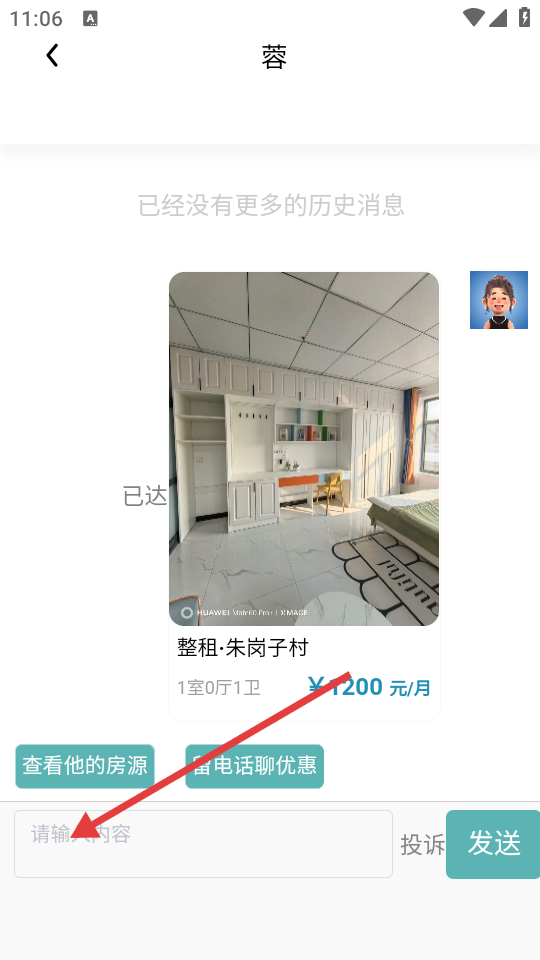 4、在聊天界面的输入框中输入内容,点击【发送】,即可与房东沟通租房相关事宜。